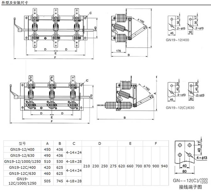 該隔離開關(guān)為三相聯(lián)動式,由底架、轉(zhuǎn)軸及聯(lián)動板、支柱絕緣子、導(dǎo)電閘刀幾靜觸頭等部分組成。轉(zhuǎn)軸裝在底架上,軸上焊有聯(lián)動版,通過拉桿絕緣子與閘刀相連。轉(zhuǎn)軸兩端伸出底架,其任何一端均可與操作機(jī)構(gòu)相連進(jìn)行分、合閘。本系列隔離開關(guān)可以水平、垂直或傾斜安裝。