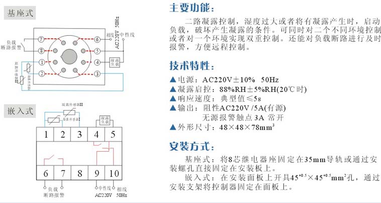 二路凝露控制,濕度過大或者將有凝露產(chǎn)生時(shí),啟動(dòng)負(fù)載,破壞產(chǎn)生凝露的條件??赏瑫r(shí)對(duì)二個(gè)不同環(huán)境控制或者對(duì)同一個(gè)環(huán)境實(shí)現(xiàn)雙重控制