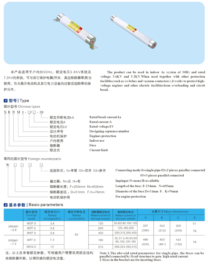 本產(chǎn)品適用于戶內外50Hz,額定電壓3.6KV系統(tǒng)及7.2KV的系統(tǒng),可與其它保護電器(開關、真空斷路器等)配合使用,作為高壓電動機及其它電力設備的過載或短路等的保護元件。(通過了國家高壓電器質量監(jiān)督檢測中心型式試驗,產(chǎn)品符合GB15166.2和IEC282-1)。